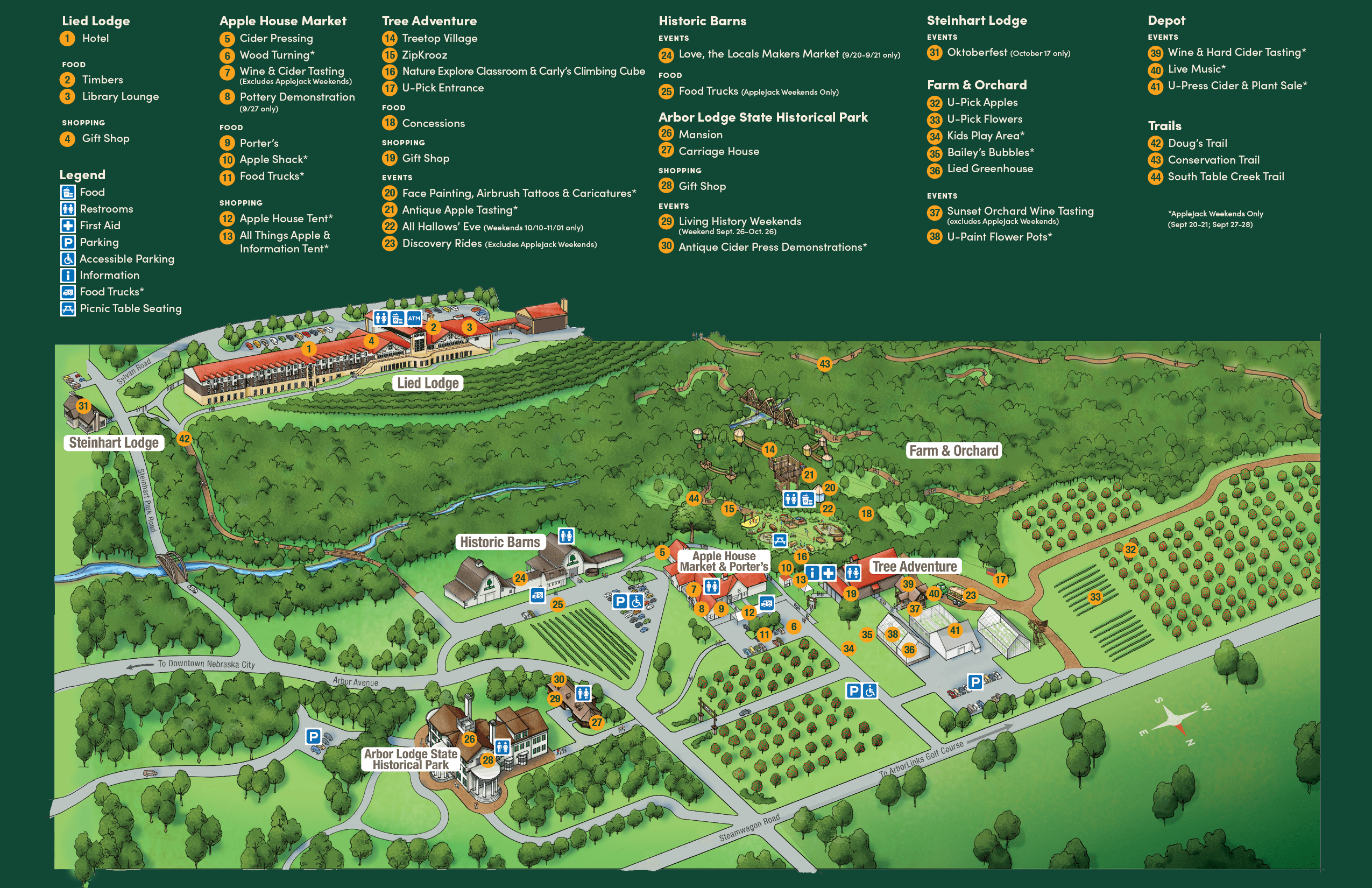 About Us Property Map Explore Activities All Experiences Activities Tree Adventure This year-round experience is the heart of Arbor Day Farm, with fun and excitement around every bend. Activities Historic Arbor Lodge The highlight of this 72-acre park is the historic mansion, with its 52 rooms and countless historic artifacts belonging to the Morton Family. Amenities Shopping Treat yourself or someone you love to a little something special from one of the many shops throughout Arbor Day Farm.